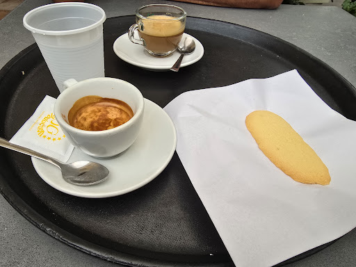 Read moreIl bar è dall'aspetto molto moderno e ben organizzato e pulito con la disposizione dei prodotti in vendita ben curata ma dai prezzi un po' sopra la media. Dispone di gelati a cono e coppetta, tramezzini e panini, pasticcini e vari snacks. Aperto fino a tarda notte, ma le indicazioni su GMaps indicano 24/24 e non ho verificato se fosse realmente così, dispone anche di un'area esterna coperta da gazebi in plastica con tavolini e sedie. La consumazione al tavolo seduti ha una maggiorazione di 0,30 euro di notte, non so se anche di giorno sia così. Il parcheggio è pressoché impossibile trovarlo e bisogna arrangiarsi parcheggiando in doppia fila con i problemi che comporta. Possibilità di accesso anche ai...