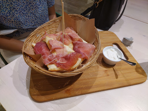 Read moreArrivati alle ore 17:45 di domenica, non c'era nessuno al bancone. Dieci minuti dopo, è comparso un signore che ha fatto da cassiere e da cuoco. Abbiamo preso lo gnocco fritto "Parma" (prosciutto crudo e squacquerone). Il formaggio è servito a parte in una ciotolina. Il piatto è molto ricco, ci sono 7-8 gnocchi fritti, ciascuno dei quali con una fetta di prosciutto crudo sopra. Gli ingredienti sembrano molto buoni. Il servizio è...