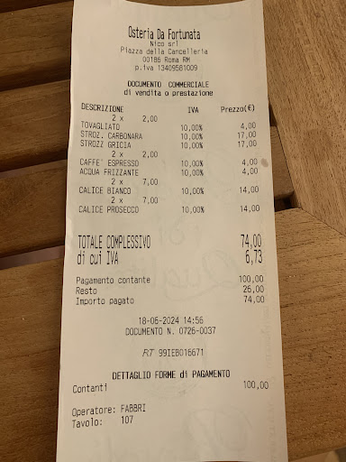Don’t go here unless you speak fluent Italian, otherwise, even if you try to speak Italian, they will discriminate against you. We were seated for over 20 minutes before even getting a menu which we had to ask for. First, thought it was because they were busy, but not true. Servers were socializing with each other, not working. At least three parties were seated after us and immediately given menus and drinks before us. I was ready to walk out but my wife stopped me, my only regret of our entire vacation. Everyone was packed in like sardines in the seating area, you literally had to move your entire table over so the patrons next to you could shimmy through the small space created between tables. Servers bumped into me multiple times without an apology. Food was overly salted. The pasta was well made at least (hence two stars instead of one.) Most expensive meal of our entire vacation, other than a Michelin star restaurant we went to, even though we only had some wine, a single pasta course each and a cafe. Please see attached receipt. They charged us 4 euros for the privilege to be given terrible service. Oh yeah, I almost forgot about the poor woman they dressed up in a costume and forced to make pasta in the front window. (Who was sweating and obviously miserable according to my wife.) At the end of the worst meal we had in Italy they had the gaul to solicit for tips and even had a tip jar!!! Please save your money and go to a real restaurant. They actually have another restaurant in Miami, FL. I live in Florida and I will tell everyone who will listen not to support this awful organization.