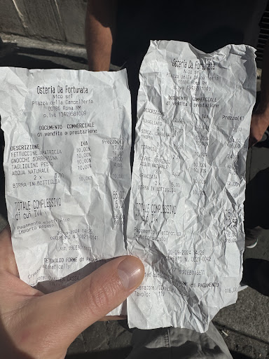 Then another waiter came over, started yelling something in Italian and waving his hands, grabbed the two receipts and threw them in the trash. He then brought back other crumpled receipts, again not ours and not for our table, and continued to tell us that we needed to learn math and that everything was correct. This was untrue and completely unacceptable! We do not recommend this place and will never return.