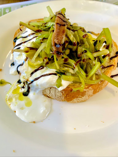 -Slightly toasted bruschetta with burrata cheese, puntarelle marinated in oil, garlic and balsamic vinegar, with a few slices of anchovies on the top - amazingly interesting blend of tender burrata, fresh and juicy puntarelle with a savory finish of anchovies on the top.
