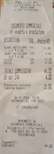 Read moreVado con un amico a prendere due pinse essendo la pizzeria vicino casa. Nell'attesa prendiamo due birre alla spina PICCOLE. La birra era totalmente avariata, si vede che il fusto era lì da un bel po' di tempo, siamo stati sciocchi noi a non dirlo, è vero, ma lo abbiamo fatto solo per educazione. Ebbene quelle due birre piccole andate a male ci costeranno ben 11€! Arrivano le pizze, io la mia birra la lascio nel bicchiere quasi intera ma la proprietaria non mi chiede il perché, scioccamente prendo altre due birre piccole dal frigo, Ichnusa, le più commerciali del mondo, mi costeranno 4.50 l'una. Totale 44 € due pinse (che non erano niente di che anzi... Anche piccole) e 4 birre piccole di cui due nemmeno artigianali ma commerciali. Non so perché ma ho pagato senza dire nulla e sono andato via, quella sera non avevo voglia di vociare come spesso faccio in questi casi ma mi sono ripromesso di lasciare poi una recensione. Lascio lo...