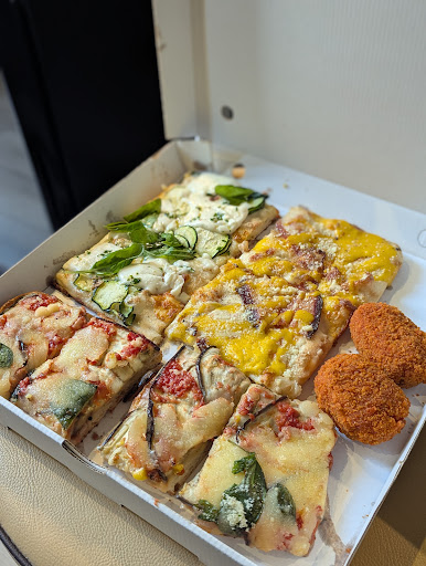 Read moreCredo che sia veramente la migliore pizza al taglio a Roma. L'assortimento della pizza verso l'ora di pranzo è vario, e non mi ha mai deluso, neanche le "banali" sono da ignorare. Il tutto è condito dal sorriso delle ragazze che servono. Nonostante l'affluenza costante, le richieste più strane per i pezzi di pizza loro sono sempre professionali e attente alle esigenze del cliente. Credo che una menzione speciale la meriti la pizza Prosciutto e fichi, presente ovviamente solo d'estate. Ed i supplì, anche questi per me i migliori di Roma, e ne ho assaggiati tantissimi. Quello alla carbonara è spaziale, e non ne basta mai uno solo. Lo spazio è piccolo per consumare, si sta in piedi ma ci sta. L'unica pecca è che la sera è chiuso e ci sta data la minor presenza di lavoratori, ma prenderei della pizza nelle occasioni speciali per portarla a casa. Mi spiace che ci sia solo un Pò Mò a Roma, ma questo format vince ed è nettamente una spanna sopra le altre pizzerie al taglio...
