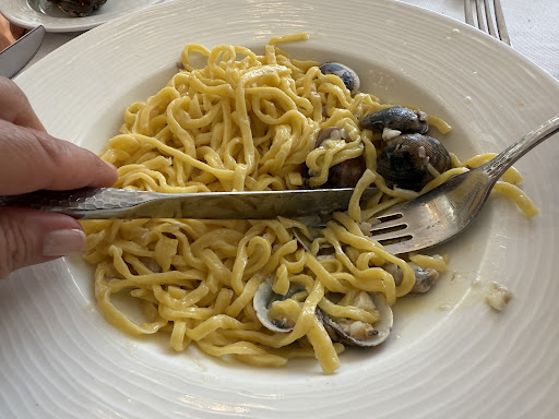 Read moreCenone di capodanno (ovvero stanotte) Menù fisso con animazione (ballerine brasiliane e musica tipica di fine anno) Premetto che pur avendo mangiato lì tante volte non sono mai stata particolarmente entusiasta della qualità del cibo, ma questa può essere una cosa soggettiva... Ieri sera al modico prezzo di 90 euro per un cenone di fine anno (siamo in linea con le richieste generali comunque). Antipasto di pesce molto anni 80. Al voto direi appena sufficiente. Due assaggi di primi: anche qui anni 80 for ever con risotto con crema di scampi. Voto 6-. Paccheri con gamberi (tante teste) e branzino (sembrava tonno) , pasta cruda e nel piatto di mia sorella condimento 0. Voto 4 -. Secondi piatti (serviti in un unica soluzione, ovvero nello stesso piatto) filetto di spigola in crosta di patate e fritturina di calamari (unica cosa decente). Nel menù comparivano due vini:Falanghina (di infima qualità) e il Montepulciano, quest'ultimo non pervenuto proprio e a questo punto è pure meglio! Alle 22 entrano le ballerine brasiliane che dopo tre canzoni alle 22 40 si rivestono in fretta e furia e vanno via. Ho temuto di rivivere la scena cult di Fantozzi dove si portavano avanti le lancette dell'orologio affinché l'orchestra potesse suonare in un altro locale... Piatto di lenticchie portato alle 23, quando è noto che si servono alla mezzanotte come buon augurio! Spumante dozzinale da discount. Musica standard per il capodanno messa da pc. Ambiente obsoleto. Unica nota positiva il servizio rapido ed eccellente (tutti camerieri anziani anagraficamente e quindi con esperienza pluriennale.) Credo d'aver detto...