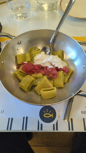 Read moreChe dire…nient’altro che una buona campagna di marketing sui social! Ci vai perché incuriosito ma non ci torneresti! Abbiamo provato il loro famosissimo menù pescanza (6 antipasti e 4 primi ‘no limits’), spiacevolmente di antipasti ne abbiamo ricevuti solo 5 e i primi erano alquanto discutibili. Iniziano col risotto di scampi (di scampi, però, nemmeno l’ombra), quantità sproporzionate per due persone, quasi ad aver la sensazione che sperano di non doverti portare altro perché sazio al primo primo. Spaghetti con i lupini, nella media ma non eccezionali. A seguire un piatto che non era nel menù e nemmeno fra le portate che ci erano state elencate: attendevamo un tagliolino con crudo di gambero rosso e crumble di nduja, ci arriva un piatto presentato come tagliolino al sugo di nduja con calamaro (?) che in realtà era un polpo. Il piatto era senza sapore e pesante, tanto che abbiamo dovuto fermare la nostra cena, senza proseguire con l’ultimo primo. Il servizio è stato piuttosto approssimativo. Abbiamo trovato dei pezzi di una rete di plastica nei moscardini sulla bruschetta insieme ad una chela di gambero. Fatto notare al cameriere, si scusa dicendo che lo avrebbe fatto rifare: non abbiamo mai ricevuto nuovamente quel piatto e non ci è stato nemmeno scalato dal conto o non si è provato, comunque, a rimediare in altra maniera. Adesso, di sicuro, in risposta alla mia recensione, mi verrà detto che forse mi sono confuso con un...