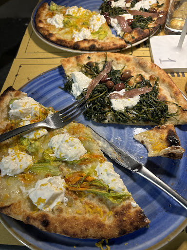 Started with an amuse bouche that was an Arancini ball with chicken liver mousse. It was a nice bite to start the meal. Had the potato chips and the mixed fried zucchini flowers, one had cheese on the inside, one had anchovies with cheese and one had ham with cheese. It was a nice mix of 3 different fillings and the batter was light. Next came the pizza. Honestly each pizza was more than enough for 1 person (depends on how hungry you are) and we tried the carbonara (white pizza), diavola (pepperoni) and the capricciosa which had an egg in the middle with olives, mushrooms, artichokes and Parma ham. All 3 were great, crust was perfectly thin and crunchy without being overcooked. Finally ended with the basil and peach panna cotta that had a little ground black pepper on top. They gave us each a taste of tiramisu to end the night.