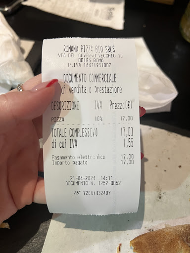 Read moreWanna try several types of Roman pizza? The Pizzeria Romana Al Taglio at the Via del Governo Vecchio is an ideal place. You can choose pizza rectangles with different toppings. We pick three: bacon, pecorino cheese and tomato; prosciutto, mozzarella and pine nuts; and mushrooms. The guests can eat in or take it out to the street. The dough was crispy, tasted like a well raised sourdough bread. The prosciutto ham was roasted like bacon. Pecorino was pushing through by its salty flavour. Pizza prices range from 2,50 to 5 euro per piece, depending on the topping. To satisfy hunger, one would need 3-4 pieces and he or she can go on discovering Rome. However, this place is not ideal for long dinners, where guests spend time talking over their pizzas. They accept only card payments and there is a toilet in the premises.