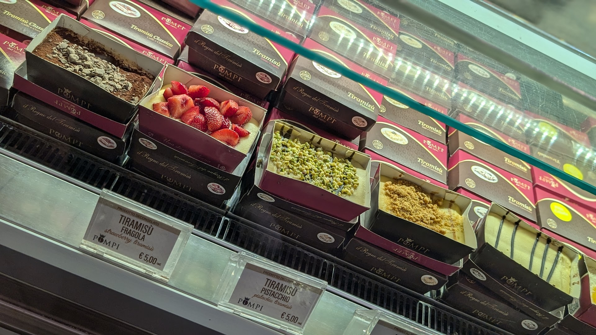 Il Protagonista: Il Tiramisù • Classico: Il cuore dell'offerta Pompi è il suo tiramisù classico. Si presenta in una monoporzione generosa, servita nella loro iconica scatolina rossa. Il gusto è equilibrato: una crema al mascarpone vellutata e non eccessivamente dolce, biscotto di produzione originale ben inzuppati nel caffè (senza essere mollicci) e una spolverata abbondante di cacao. È la ricetta che ha reso Pompi famoso, e rimane per molti la scelta migliore. • Varietà: Oltre all'intramontabile classico, l'azienda ha saputo rinnovarsi nel tempo introducendo numerose varianti di gusto che cambiano anche stagionalmente. Tra le più popolari e quasi sempre disponibili ci sono: • Fragola: Un'alternativa fresca e molto amata, soprattutto in primavera/estate. • Pistacchio: Cremoso e dal sapore deciso di pistacchio insieme alla granella croccante. • Banana e Cioccolato: Un abbinamento goloso. • Caramello Salato: Per gli amanti dei sapori più intensi. • Altre varianti possono includere mango, nocciola, cocco, ecc., a seconda del periodo. • Qualità/Formato: Il tiramisù è pensato anche per l'asporto, grazie alle pratiche confezioni monoporzione. Questo lo rende perfetto per una pausa dolce passeggiando per la città o da portare a casa. Esistono anche formati più grandi da 4/6, 6/8 e 10/12 porzioni. Su ordinazione inoltre, ci si può sbizzarrire con forme, aggiunte e Tiramisù decorati a Torta.