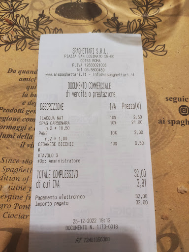 Read moreThe atmosphere is pretty good. The food not so great. At least what we had. It looks better than it tastes. I think tourists would like the food well enough if they don't really know authentic Italian food, but there are much better places to get Roman food. My wife had a salad that had way too much bitter rocket (eruca or arugula) and unripe tomato chunks. I myself love spaghetti alla carbonara. It is a specialty of the Lazio region. It was bad. The guanciale was cut in random sized pieces and was under cooked. I can't really describe the cheese and egg sauce, but it wasn't what I know as carbonara. I will never order it there again. And be careful about ordering the "house" wine. It's usually lower priced but good bulk wine. At this place the house wine is a bottle of generic commercial wine with the "house" label. ...