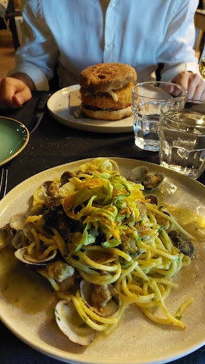 Read morePeccato dare queste due stelle. Il personale è correttissimo, il servizio veloce, il luogo gradevole, i tavoli correttamente distanziati, i menu sembrerebbero essere monouso (fogli A4 stampati), c'è possibilità di accesso con cani. Le due stelle sarebbero state tre, ma lo rendono impossibile, a nostro giudizio, due gravi pecche: l'assenza di un qualsivoglia igienizzante mani all'ingresso; acqua solo microfiltrata in caraffa: in tempi di covid, ci si aspetterebbe almeno l'igienica alternativa di una minerale stappata al tavolo. Da queste due speriamo sviste, il locale è fortemente penalizzato. Altre note critiche: lista vini accessibile solo tramite un QR code; se non si riesce a catturarlo, niente vino, o qualche vino a memoria del cameriere, o consumazione al bicchiere. Noi non abbiamo avuto fortuna col QR code, non abbiamo ricevuto alcun aiuto, abbiamo ripiegato su due calici di Merlot che sapeva vagamente di tappo; cucina fantasiosa ma di esecuzione velleitaria. Due sole proposte, entrambe antipasti, ci sono sembrate davvero riuscite: maritozzo salato con spigola e lime, particolare e sapido (servito, peraltro, in un piatto originale ma troppo piccolo, da cui il maritozzo strabordava, rendendo difficile usare la forchetta per mangiarlo), e millefoglie con mortadella e burrata. Poi due piatti senza nulla di rimarchevole: pici cacio e pepe e millefoglie alla crema. Infine, due decisamente deludenti: tagliatelle con alici fresche, pomodori ecc, un gran guazzabuglio dai sapori confusi, e semifreddo al pistacchio e caramello salato ucciso da un'eccessiva colata di panna. Ci auguriamo che quanto segnalato possa essere di aiuto e miglioramento per un ristorante dalle buone...