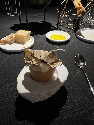 The good: Service is courteous and professional as is expected from an establishment with $$$$ price tag. Lighting and presentation of dishes that's very Instagram friendly if you are into that sort of thing. The bad: The drinks whether alcoholic or non-alcoholic are completely unimaginative. If you want a gin and tonic that you can order in any mediocre hotel - you'll be fine. If you are looking for interesting and creative cocktails this is not the place. I guess this establishment assumes you will be drinking wine - which we did not. Gimmicky presentation of many dishes that does not add anything to the experience but, in fact, stands in the way of trying to enjoy the food. Pasta filled with broth is served with a massive spoon with holes in it - not sure how that's supposed to enhance my experience, the size of the spoon however makes the pasta difficult to enjoy. Carbonara reduction is served in an eggshell which looks interesting - until you accidently break a piece and then have to look for a piece of eggshell in that dish. There is more, and I am only keeping the number of examples at two for brevity. The ugly: The food. We had their most expensive tasting menu. Most of it was not memorable and the top three adjectives that come to mind are: oily, salty and heavy. Some "highlights" below: "Tiramisu" of potatoes: this is supposed to be a dish that looks like Tiramisu dessert when it fact it is a savory course. Unfortunately beyond this presentation gimmick this dish is terrible. What you have is a heavy potato puree, that lacks any flavor. You have a lot of it. If you manage to dig through it you will eventually get to salted cod, which looks and tastes like something that came out of a can. This cod is swimming in abundance of olive oil which makes this dish even more heavy (if that's even possible). It is also quite salty living up to the description - 'salty cod'. But wait, there is more; there are pieces of bacon at the bottom of the dish that make this even more salty and heavy. This is something I would expect in a bad diner. Not a fine dining establishment. Carbonara Reduction: This dish constitutes an eggshell that's filled with concentrated (read: reduced) carbonara sauce. It's like someone decided to take the best parts of a carbonara dish away, and shove the rest into an eggshell. The reduction has the flavor and consistency of a warmed up, light mayonnaise that's flavored with some bacon flavoring. Not sure if there is anything else I can add to this description. It is as bad as it sounds. "Rocher" of Oxtail: The "gimmick" of this dish is that it's an oxtail meatball that's supposed to look like Ferrero Rocher confectionery. I will let my pictures help you decide if it does it for you or not. In terms of the dish itself; imagine ground oxtail, imagine mixing it with some nuts, copious amount of salt, tomato paste and then cooking it. What you get is heavy and salty meatball that kind of taste like tomato paste. This dish is begging for flavor. Something herby, spicy, fresh, bitter, sour, any flavor really. And then you notice a tiny green droplet on the other side of the plate. You desperately reach for it. It is the celery gelee. It's bitter, and it tastes like celery. And it kind of balances out the horrible bite of oxtail meatball you are about to have. And then it's gone, because there is about a quarter of a teaspoon of it. And you are left to contemplate what you are going to do with that giant salty meatball that's still on your plate. And you decide to not...