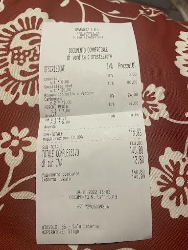 We had to wait for bill quite a long time after we were ready. I was forced to step up and aski from restaurant. Only the boss was allowed to give bills, I saw. The we got invoice, it had one row 0,01€ for drink we said we don't want to. Then there were row "magglorazione", which didn't tell anything, boss said it is somekind of tax or service or something. I told them when asked for the invoive to make sure invoice is correct, this was the result. Scam.