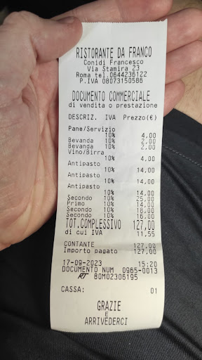 Read morePS (in risposta): Buonasera, sì, come riporta lo scontrino, siamo venuti da Lei in Via Stamira 23, questa domenica 17, a pranzo.