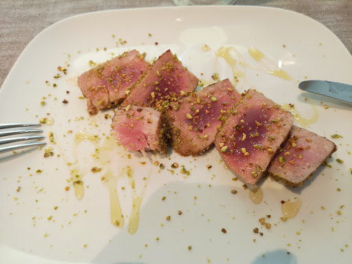 Being fish lovers, my mum & I ate an all fish dinner, made of a mix seafood starter (antipasto di mare misto) for 2 people (marinated octupus, fresh tuna, salmon and mussel). As a main, my mum chose a Sweet Tuna stake while I preferred a "branzino" (seabass) cooked with olives, pesto and some other juicy ingredient I can't recall.