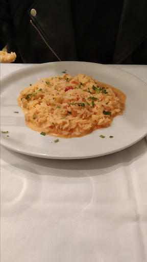 Risotto takes skill to make, I cannot do it without great effort and attention. This restaurant skips the care and attention and makes something else; "Boiled long grain rice with those tiny frozen prawns.. Drenched in a canned tomato sauce with butter melted through it"