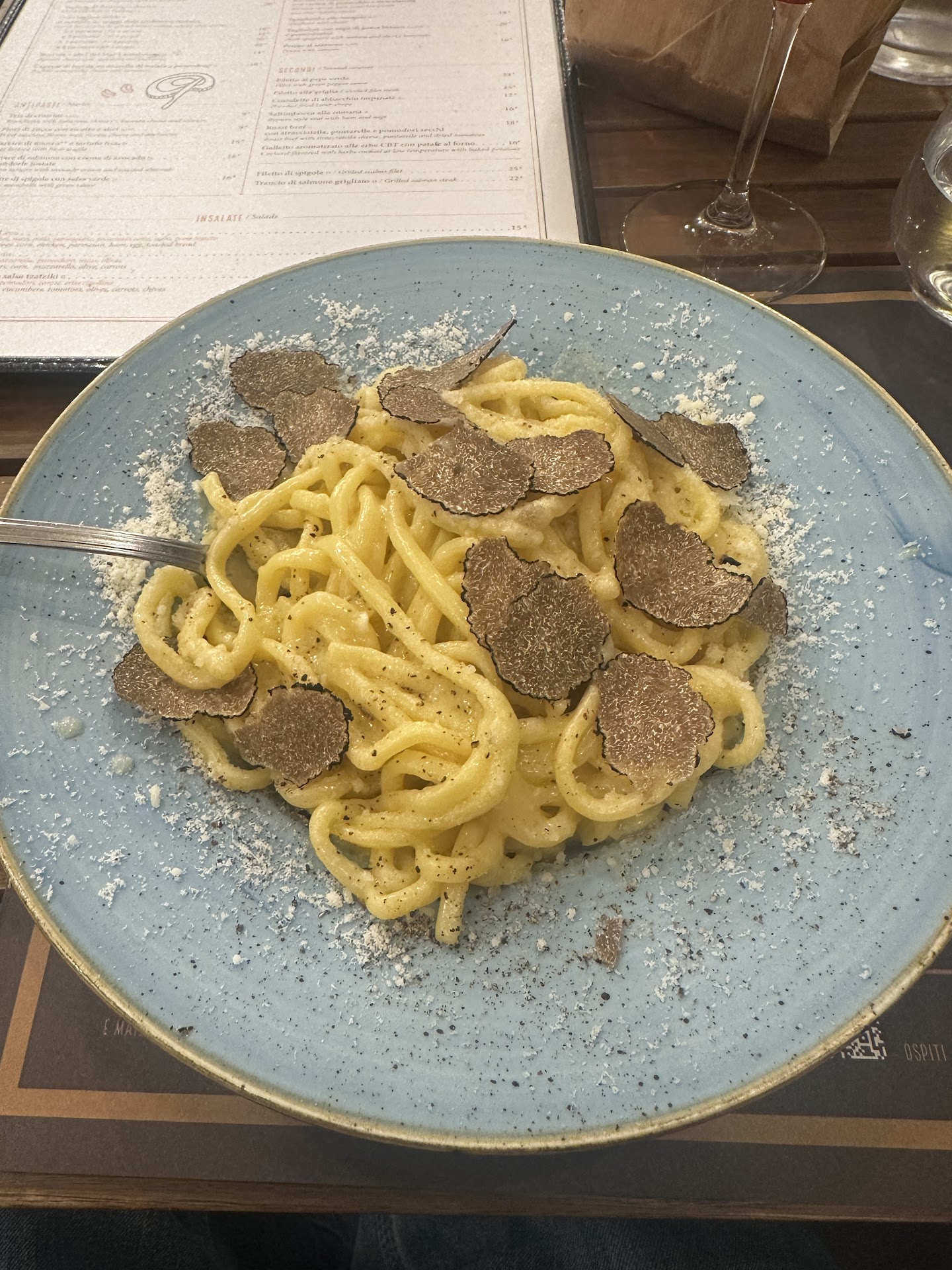 As a waitress who is very lenient and understanding about slow service, this place still managed to surprise me. My boyfriend and I came around 2pm on a Saturday, the restaurant was maybe half full. The service started out strong, somebody greeted us at the door and offered us a table inside, we came in with him and he took us to a dirty table in a corner, and assured us that somebody would come around to clean it in one minute. Once ten minutes had passed of us just standing in the dining room, I ended up asking somebody myself to clean it. I found all of the waiters (there were a good few) in a circle by the door, just talking. The only helpful member of the staff, the only one who seemed to be doing his job, asked me if I needed any assistance while going to help another table. He cleaned our table quickly and was apologetic, and by doing that alone was the highlight of our meal. We sat down, ordered water, and started looking over the menu. Maybe 15 minutes had passed when our waitress came back for our orders, I still hadn’t received my water, but I decided to order a cocktail as well. She cut me off half way through my ordering my cocktail to rudely inform me that my water was coming. It took about 20 minutes for our food to get to us, which usually wouldn’t bother me much but we had already been in this restaurant for about 30 minutes by the time we were able to order, and many other people who had arrived long after us had already received their food (keep in mind that my boyfriend and I had only gotten one pasta dish each and a cocktail, nothing elaborate). Once our food did arrive, my cocktail was missing, my boyfriend’s food was very bland (some spaghetti with pepper dish), and my food (the carbonara) was cold, and resembled as well as tasted like glorified kraft mac & cheese. You can get better pasta from a gas station. Incredibly disappointing as this was our last pasta in Italy and all the good reviews gave us hope. I recommend this restaurant if you’d like overpriced food served by rude waiters and you have nowhere to be the rest of the day.