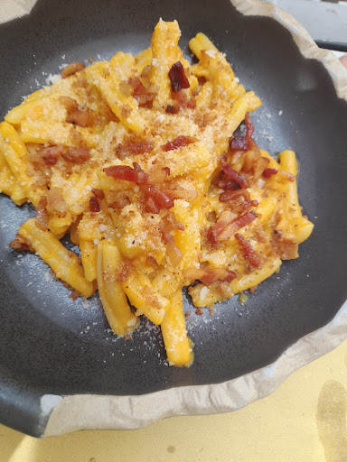 What an amazing little find. Not exactly the beaten track, on a main road with spaghetti junctions all around that make it really a challenge to get to, this is a gem that is worth a detour. We had a 2 starters of grilled porcini that were a perfect balance between melting and meaty, simple and fragrant; and crispy arancini meatballs - no hint of oiliness and actually quite delicate in spite of sounding heavy. My tonnarelli (like a very fat spaghetti) with porcini were delicious and nicely al dente, and my wife had a filet of dentice which is a kind of snapper. The fish perfectly cooked - it was juicy but crisp on the outside. For afters we had an Apple cake that was possibly the best bit of a great meal. Wines were all local, and I loved the cesanese del piglio and the local amaro they gave me afterwards. We will definitely be...