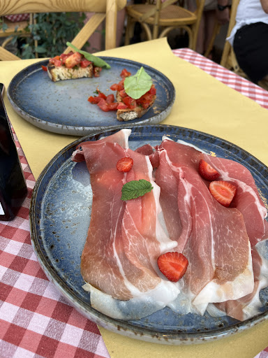 CONS: the risotto was so disappointing. Not much flavour. Watery. All in all, not worth the money. bruchettas. Dull. The tomatoes lacked punch and flavour. 12 euros for Parma ham and melon (to expensive) the house red wine. Served as warm as the weather (tasted like 32 degrees). Very simple and a bit borring wine.