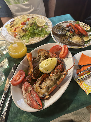We ordered a grilled lobster (€50), grilled mixed vegetables, and a large sea bass. The sea bass was slightly overcooked but still edible. The grilled mixed vegetables, as shown in the photo, had several pieces that were quite burnt, which made them unpleasant to eat.