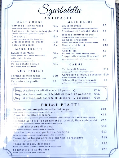 Tra gli antipasti consiglio i “moscardini fritti”, il “crostone con arrabbiata di totani e hummus di ceci”, nonché gli spiritosi, ma anche ottimi “supplì alla crema di scampi”. Tutti consigliati i primi, con una stellina in più per gli “spaghetti con vongole veraci e bottarga” e per i “paccheri con cozze, pachino e pecorino”. Tra i secondi i nostri maggiori consensi sono andati al “baccalà con patate su vellutata di ceci” e ai “tentacoli di polpo rosticciati su purè di patate e paprika”. Ma anche i “saltimbocca di spigola” e la “frittura di calamari con verdure croccanti” erano tutt’altro che male.