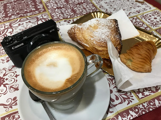 The cappuccino is well-executed: dense microfoam, a clean crema ring, and no visible curdling—signs of fresh milk, proper temperature, and good emulsification. Its pale body indicates a milk-forward pour, in line with the Roman preference for a gentle, smooth start to the day. The Canon G7X in the background marks this as a traveller’s table, yet the moment is...
