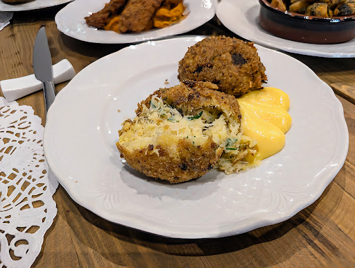 Poi passiamo alle polpette di bollito, sempre di pesce. La crosta esterna è sottile ma croccante e come si rompe lascia il posto al pesce morbidissimo, si scioglie in bocca, accompagnato da una maionese dal gusto fresco dove intingere la polpetta.