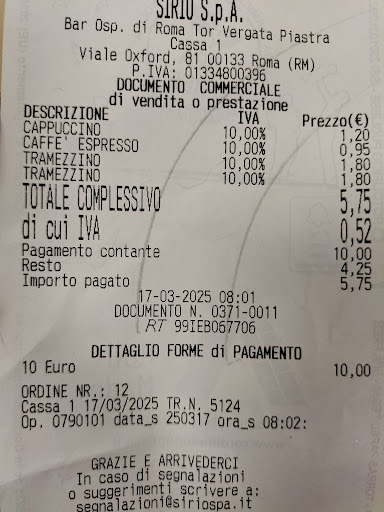 Read morePremetto che la gente non va in ospedale per divertirsi.... premetto; che tutti abbiamo i nostri problemi, vivendo ormai in mondo finito, dopo aver attraversarto Roma con i mezzi pubblici con mia figlia di 12 anni per farle fare una delle tante visite che dovrà fare prenotate da 2 anni, uscendo dall'ospedale decido di fermarmi in questo bar per prendere un caffè per me con un cornetto sia per me che per mia figlia. Volevo fare una piccola sosta prima di farmi 3 ore viaggio per tornare a casa e cosa succede????? Una commessa a dir poco sgradevole mi ha urlato contro per ben 2 volte senza che io non le avessi rivolto la parola solamente perché ero vicino ad un pezzo di bancone del bar dove c'era un cartello che dichiarava che quel posto era per disabili, ovviamente io non me ne sono accorta altrimenti non sarei stata così "cafona" come mi ha fatto intendere la commessa. Be che devo dire? Le cose ci sono modi e modi per dirle, cara commessa devi abbassare la cresta perché non sai chi ti puoi trovare come cliente! Ma questo non solo nel lavoro, ma anche nella vita di tutti i giorni. Cornetto e caffè pessimo! Che oltretutto mi è andato anche di...