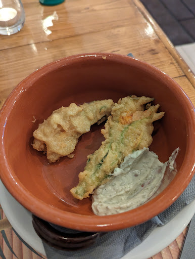 Ci fidiamo del proprietario che ci consiglia antipasti misti, uno più sfizioso dell'altro. Anche se venivamo dalle mangiate abbondanti dei giorni di festa ci siamo spazzolati tutto: carciofi fritti alla paprika con deliziose salsine alla maionese vegan aromatica, Una salvia fritta in pastella assolutamente da provare e una originale e gustosa bruschetta con avocado e funghi galletti.