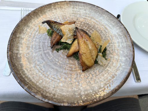 Feeling jet lagged and needing sleep I was ready for a clean, filling meal. I sat outside & after a brief look at the menu I ordered the seared mackerel fillets on chard. Now, Mackerel is a generally a large fish, I’ve caught them before, and yes usually they’re cut into steaks but hey, maybe they fillet them here, either way it still sounded substantial as a Secondo.