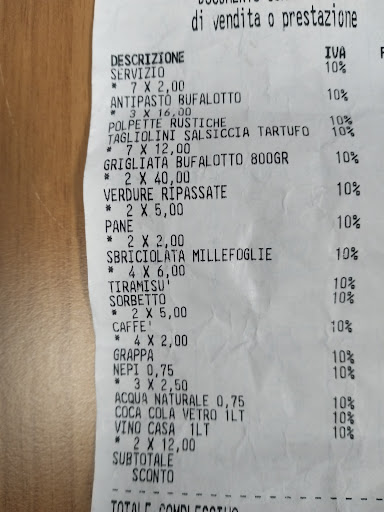 Read moreSiamo stati al bufalotto a pranzo per festeggiare un compleanno. tavolo da 8 pp. Ambiente piccolo e tranquillo con unica cameriera. Cibo discretamente buono abbiamo preso antipasto con 10 bruschette con pomodoro con lardo e con salsiccia e carciofini fritti 6 primi 2 secondi due brocche di vino della casa 4 bottiglie di acqua. Prenotato per le 13.30 seduti alle 13.40 serviti con gli antipasti alle 14.15 ed il locale era semi vuoto. La cucina chiude alle 15.00 ma la cameriera avendo preso solo l ordine di antipasti e primi non per nostra scelta, ci comunica solo dopo nostra richiesta che avendo chiuso la cucina alle 15 non potrà servire i secondi ma volendo solo i contorni. Quindi molti di noi sono usciti di lì con la fame. Per finire in bellezza nello scontrino scopriamo che hanno aggiunto il costo di €1,00 a persona per il taglio della torta tra l altro portata da noi. A saperlo ce la saremmo tagliata da soli. Per una buona ristorazione non occorre avere solo buoni prodotti ma anche buoni ristoratori. È certo che non torneremo. Ci siamo sentiti presi in giro soprattutto per un euro a persona per il taglio della torta.......