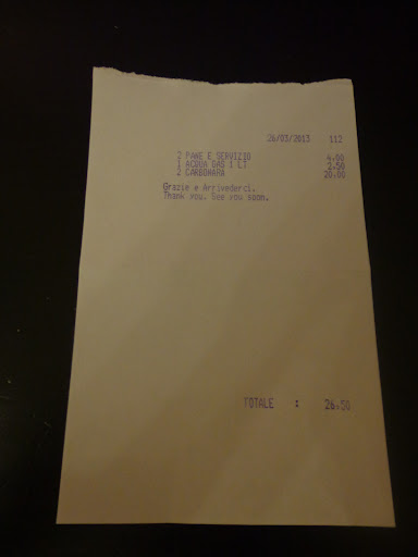 As soon as they realised that they were not getting the big bucks from us they had the carbonara on our table within 10 minutes (the cooking time magically reduced!). As soon as we finished it (in less than 5 minutes) the waiter took our plates immediately and asked us in a eat-something-else-or-leave manner if we wanted to order something else. I replied "No, just the check please". To our surprise we were charged "2 PANE E SERVIZIO" for 4 euros... The bread was 3 slices. And instead of a receipt we were given the piece of paper with our order on it.