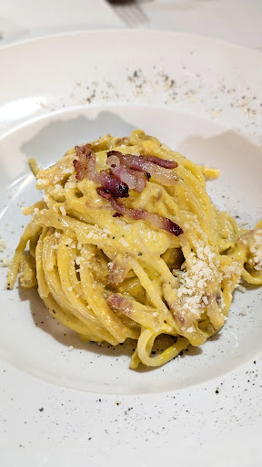 As we had read so much for their carbonara, we wanted to try just that. We were going to eat pizza later elsewhere but wanted to stop here first for a quick carbonara before we did so. So we ordered two carbonaras. I tried to be extra kind and (apart from my "grazie" which I said all the time) I told the waiter -with a broad smile on my face- that we had heard many people suggesting this place and their wonderful carbonara. He stood there looked at me with a serious face, not acknowledging my compliment and just waited there looking like he was bored (which I'm sure he was). He spoke perfect English so it wasn't a language thing, it was an indifference thing and I regret the moment that I complimented them.