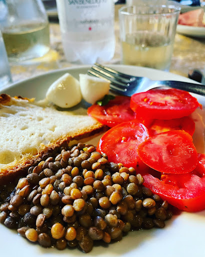Not long after, three appetizer courses showed up. Decent prosciutto with two bocconcini, a salted tomato and basil dish that reminded me of what often tops bruschetta in the States, and a big plate of lentils. A bread basket came as well. These items were pleasant. As I finished them, another plate with three random fried things arrived. A visit to google maps suggested it was two rice balls and a veal meatball. These were unremarkable.