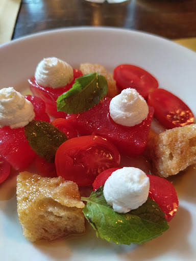 You start with fresh bread and sun dried tomatoes with mint - a bite of summer in Italy. We then had delicious cod and potato croquettes and a divine watermelon and tomato salad (such a great combination - who’d have thought?). The pastas were equally yummy - the whole wheat pici alla gricia was elevated by punchy mint, and homemade tagliatelle was served with sheep’s milk cheese and aubergines. The main was a special - red mullet with peppers and capers. It was unique and delicious and impossibly fresh, and a great segue to dessert - a perfect chocolate mouse, with sea salt, olive oil, and crispy Sardinian bread. I also had a beautiful rosé from Campagna that paired well with the meal, and we were served complimentary amaro liqueur at the end.