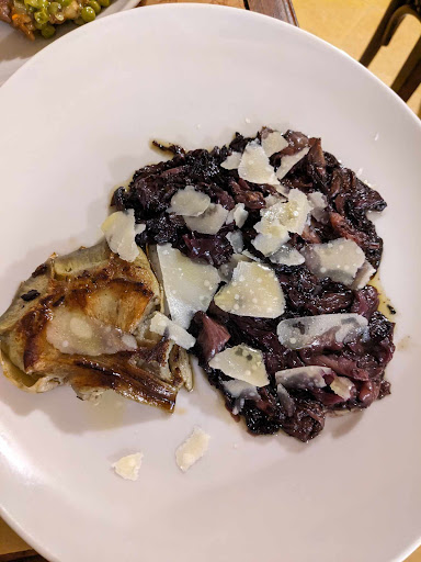 We ordered the grilled artichoke and onion salad, fresh pasta with bacon/pecorino cheese/orange peel, and veal shank.