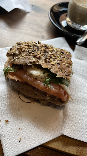 Read moreVery nice sandwich with salmon, cheese and rocket 😋 I asked it to be toasted so it was nice and crunchy. The coffee was a latte, often I ask it to be lactose free but here in Italy seems to be a challenge to get this across, so I drunk it with normal milk 🫣. Anyway it was strong in the coffee taste but really enjoyable.