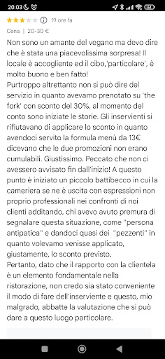 Non sono un amante del vegano ma devo dire che è stata una piacevolissima sorpresa! Il locale è accogliente ed il cibo,'particolare', è molto buono e ben fatto! Purtroppo altrettanto non si può dire del servizio in quanto avevamo prenotato su 'the fork' con sconto del 30%, al momento del conto sono iniziate le storie. Gli inservienti si rifiutavano di applicare lo sconto in quanto avendoci servito la formula menù da 13€ dicevano che le due promozioni non erano cumulabili. Giustissimo. Peccato che non ci avessero avvisato fin dall'inizio! A questo punto è iniziato un piccolo battibecco in cui la cameriera se ne è uscita con espressioni non proprio professionali nei confronti di noi clienti additando, chi avevo avuto premura di segnalare questa situazione, come "persona antipatica" e dandoci quasi dei "pezzenti" in quanto volevamo venisse applicato, giustamente, lo sconto previsto. Pertanto, dato che il rapporto con la clientela è un elemento fondamentale nella ristorazione, non credo sia stato conveniente il modo di fare dell'inserviente e questo, mio malgrado, abbatte la valutazione che si può dare a questo luogo...