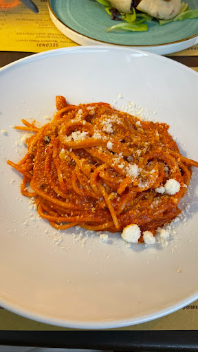 Spagertoni all’amitricana - spaghetti with a red pork cheek meat sauce. The fatty-ness from the pork cheek, which is like bacon, made the sauce so good.