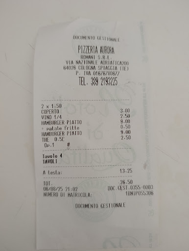 È con estremo piacere che condivido la mia esperienza alla Pizzeria Aurora, un vero paradiso per gli amanti della buona cucina e delle pizze autentiche. Situata in un'ottima posizione lungo la statale 16, il locale offre il vantaggio di un parcheggio interno, rendendo l'arrivo estremamente agevole. Fin dal momento in cui ho varcato la soglia, sono stato colpito dalla pulizia dei locali. Questa pizzeria ha un ambiente piacevole in cui gustare una pizza straordinaria. Ho optato per il servizio di asporto e ho ordinato 10 pizze con diverse farciture. La scelta è stata indovinata, poiché ogni singola pizza è stata un trionfo di bontà e qualità. Gli ingredienti freschi e genuini hanno dato vita a un'esplosione di sapori in ogni morso. L'abilità con cui sono state preparate e la cura nei dettagli si sono tradotte in una vera festa per il palato. Benché non abbia avuto l'occasione di consumare le pizze direttamente al tavolo, ho notato che l'ambiente sarebbe perfetto anche per un pasto rilassato sul posto o per una serata all’aria aperta in estate con amici. Tuttavia, la mia serata è stata resa memorabile dall'asporto. Riuniti a casa mia degli amici, abbiamo condiviso queste delizie in un contesto informale che ha aggiunto un tocco di allegria all'esperienza. Quello che distingue la Pizzeria Aurora è la qualità della pizza. Sottile e croccante, come piace a tutti noi, è il risultato di una cottura al forno a legna che ne esalta il gusto. Le farciture, sebbene abbondanti, non compromettono la leggerezza dell'impasto, aggiungendo ulteriore sapore e raffinatezza. Nel complesso, la Pizzeria Aurora offre non solo pizze straordinarie, ma anche un'esperienza culinaria completa. Il prezzo è in linea con altre attività simili, ma ciò che rende davvero unico questo posto è la passione e l'impegno che si avvertono in ogni singolo dettaglio. Per chi cerca una pizza autentica, gustosa e di qualità, questo è il luogo perfetto dove ordinare pizze da asporto. Un'esperienza da 10 e lode che continuerà a far parte dei miei ricordi culinari...