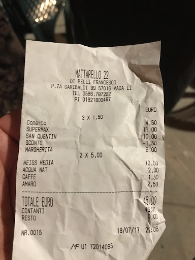 Pizza bruciata e servita fredda,secca,si sbriciolava Le pizze gourmet sono tutta un'altra cosa Per i titolari : osservate pizzeria elisir a CASTIGLIONE OLONA Inoltre se volete alzare il valore non servite acqua micro filtrata senza disporre di una minerale(aggiunta successiva:io e mio padre abbiamo chiesto una minerale alla ragazza che ci ha detto che quella microfiltrata é molto buona e non ci ha proposto la minerale) Esperienza brutta,ho avuto impressione di mangiare una pizza congelata e poi riscaldata. Anche la margherita,presa per per la bambina a 6,00 € direi di no (asciutta e con poco condimento) Posto non adatto per far mangiare bambini, almeno fino a 6 anni...(aggiunta successiva se hai un menú bambino sei adatto ai bambini viceversa se un bambino deve ordinare alla carta no non è questione di spilorceria , posti importanti nella zona come la lucciola , Fratelli catarsi hanno un menù bambino con mezze porzioni e molti ristoranti che hanno aree gioco hanno menù bambini per una questione etica di risparmio per la famiglia) Non commentiamo come vado io fuori a mangiare ti assicuro che spendo parecchio in posti importanti Siamo in un paese libero ho detto che la pizza sembra congelata ma no che é congelata , permettimi di fare una critica se il tuo prodotto non é per me Come vedi dalle altre mie recensioni riesco ad essere anche più positivo Al titolare Poter correggere una recensione ,scusa se ho corretto il prezzo della margherita con quello reale é una cosa utile che permette di correggere un informazione non corretta e permettere a chi legge la mia recensione e non i tuoi commenti di farsi un idea reale pertanto é giusto che posso correggere un informazione se non in linea , immagina se per sbaglio avessi scritto invece di 6,50 , un prezzo superiore, chi avesse letto si sarebbe fatto un idea diversa , pertanto poter correggere e oltretutto con una correzione che ti favoreggia non mi sembra anomala Inoltre ho inserito le foto dell’interno in quanto mi ha colpito positivamente e hanno ricevuto oltre 1000 visite in sette giorni non capisco la tua obiezione Ho esposto il mio giudizio nei pro e nei contro non sono uno spilorcio che tenta di speculare , mangio a cena per ristoranti spesso, quando sono venuto da te era perchè ero sicuro che mi sarei trovato bene perché avevo analizzato le recensioni ma purtroppo non è stato così,non odiarmi comunque sono sicuro che Mattarello 22 é un attività di successo Sono venuto come privato se si menziona nuovamente la proprietà intellettuale del brand con allusioni tue personali, dovró informare...