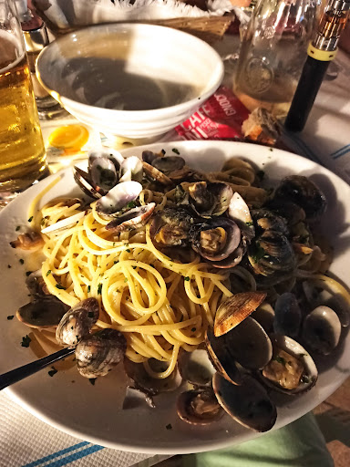 Was schade war ist, dass die Nudeln mit Meeresfrüchten eine ganze Weile vor der Pizza ankam, wodurch meine Begleitung schon halb aufgegessen hatte, als ich mrin Essen erhielt. Die Nudeln waren angeblich sehr gut (ich konnte sie nicht selbst testen), meine Pizza war gut, typisch für Italien weniger würzig als die eingedeutschten Pizzen daheim, nur der Teig erinnerte mehr an Grissini als an Pizzarand. Der zeitliche Abstand war vermutlich der Tatsache geschuldet, dass unheimlich viele Gäste Pizza zum Mitnehmen dort holen und diese Gäste schnell weiter müssen, da es sich sonst vor dem Ristorante staut.