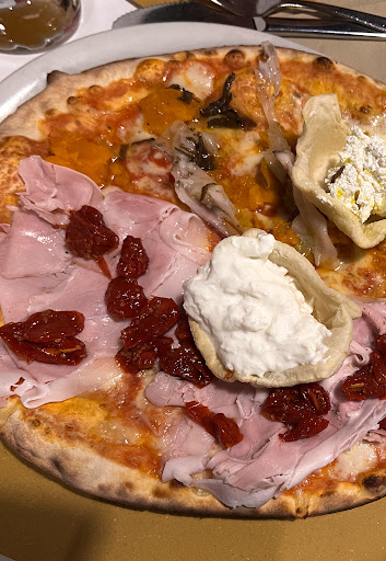 Read moreSiamo stati a cena, eravamo in 10/12, persone. Qui non prendono prenotazioni per cui quando si arriva si lascia il nome e il numero di posti e si attende. L'attesa nel complesso non è stata più di 30 minuti ma in ogni caso è scomoda questa cosa. Soprattutto se sommata ai tempi di attesa per cenare e quelli per ordinare il dolce! Il locale non è sembrato niente di che, anzi sembrava diviso in due zone molto diverse tra loro, quella dove eravamo noi più da birreria/pub, mentre l'altra sala sembrava più carina. I bagni puliti! Il servizio è quasi insistente (principale motivo delle 3 stelle, insieme alla mancata possibilità di prenotare): hanno lasciato al tavolo tovagliette e posate e ce le siamo distribuite!! Ogni volta che si chiedeva qualcosa a una cameriera bisognava richiederlo altre tre volte altrimenti non arrivava! Proveremo a tornate per provare altre pizze! Passando alla pizza pezzo forte: tantissima scelta e tantissime possibilità di combinazione di gusti diversi! Gli ingredienti abbondanti e buoni, per i miei gusti la pizza è sottile... i cestini con le varie mousse/creme ai formaggi niente di che... Passando ai dolci il tiramisù era buono, mentre il cestino di frolla con la crema le fragole e la Nutella fusa non era granché. Tralasciando le fragole fuori stagione, la crema e il cestino sembravano "vecchi", non freschi... I liquori alla fine, offerti, sono stati graditi, data anche l'ampia...