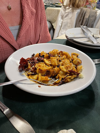 PIETANZE 8 - 10 portate di antipasto che sarebbero da sole bastate a saziarci. Una predominanza dei peperoni (forse un po' troppi in considerazione che a molti potrebbero non piacere!): in primis quello crusco, che è l'indiscusso principe della terra lucana. Peperoni arrosto, peperoni con l'uovo, patate in crema di peperoni, per poi passare ai formaggi (con la marmellata di peperoni), ai salumi, al rustico di carne e alle fritturine. Ottimo il primo fatto in casa con la mollica tostata il formaggio secco e il peperoncino. Ottime le salsicce e l'agnello (un po' meno la pancetta che è rimasta poco cotta!). Dolce preparato al momento con la crema ancora calda nel piatto ha fatto da chiusura a questa ottima cena. Un voto di eccellenza va a vino della casa: un Aglianico del Vulture (13,5 °), migliore di qualsiasi altro vino in bottiglia, che ci ha accompagnato dall'antipasto al dolce. Per chiudere in bellezza ci è stato offerto un amaro a base di alloro! Davvero carine sono state le titolari, Enza e Giusy, che a fine servizio si sono fermate a parlare con noi fino a quando non siamo andati via. Un grazie particolare va proprio a Giusy per la sua attenzione al servizio e alle richieste dei clienti. Anche quelli come noi che finiscono per cercare sempre qualcosa in più rispetto a quello che ci viene proposto. Davvero carina e sempre sorridente ci ha regalato un sorriso in più è una gran voglia di tornare a trovarla.