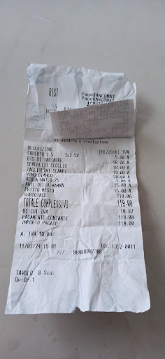 L'antipasto è un accozzaglia di rimasugli: una cozza con una pallina di pasta fritta, un pezzo di polenta fritta col formaggio, un pezzetto di salmone cotto, asciutto con una spalmata di salsa rosa, una fettina di salmone crudo ossidato e un paio di microporzioni di insalata di mare delle buste. Non ho ahimè la foto del piatto, si sarebbe commentata da sola. Mangio una porzione di insalata di mare e non vado oltre, rimando indietro. Non lo faccio mai, ma 25€ per un antipasto del genere mi ha fatto innervosire. Il proprietario viene al tavolo a chiedere spiegazioni, e con fare scocciato e offeso mi dice che non ho capito il piatto ma che me lo avrebbe tolto dal conto. Procediamo con i primi e con un fritto misto da dividere, tutto buono. Arrivati al conto, il proprietario non si degna nemmeno di chiederci se il resto del servizio è andato bene, batte il conto e mi fa pagare anche l'antipasto mandato indietro (è la voce ANTI DELLA MAMMA da 25€ nella foto). Pago e andiamo via senza ulteriori polemiche.