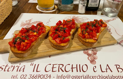 Meine Freundin und ich waren heute Abend in der Osteria il Cerchio e la Botte essen. Auf der Durchreise von Rom nach Deutschland haben wir vor der Schweizer Grenze einen Zwischenstopp gemacht und in diesem kleinen Ort hinter Mailand um 20:45 Uhr nicht mit wirklich viel gerechnet. Was dann passierte, war das beste Abendessen einer 12-tägigen Italienreise! Ich habe selbst in einer gehobenen Küche gearbeitet und kann versichern, dass die Person die hier am Herd steht professionell ausgebildet wurde, aber vor allem Spaß an dem Job hat. Fangen wir vorne an: Der Laden ist für eine Osteria typisch gestaltet und sehr sauber. Die Einrichtung haut einen jetzt nicht um ist aber auch nicht ungemütlich. Die Bedienung ist sehr freundlich und hat uns umgehend einen Tisch angeboten. Direkt wurden die Getränke aufgenommen und die Karten gebracht. Effizient, freundlich und professionell! Die Bruschetta meiner Freundin war knusprig(!) und schmeckte nach wertigem Olivenöl und reifen Tomaten. Getoppt mit ein paar Tropfen feiner Basilikumpesto. Ein Klassiker, den jede gute Küche beherrschen sollte, aber den man leider viel zu oft eher schlecht als recht serviert bekommt. Hier hat alles gepasst! Die Qualität des Fleisches meiner Vorspeise war 1A und die Vitellocreme schön samt und vollmundig. Die Chips geben den nötigen Crunsh und machen richtig was her. Hier merkten wir zum ersten Mal, dass jemand mit Konzept und Haltung kocht. Im Hintergrund laufen die großen Songs der 80er Jahre und während David Bowie Heroes singt warten wir nur ca. 10-15min. nach Ende der Vorspeise bis unsere Hauptspeise serviert wird. Als Hauptgang hatte meine Freundin Kürbisgnocchi mit Gorgonzolasoße und Birnenkompott. Als Topping knusprige Kürbisscheiben. Regionale Produkte der Saison kreativ mit Liebe fürs Detail zu einem spannenden Nudelgericht verarbeitet. In der Karte steht, dass alle Nudeln selbst hergestellt werden, womit wir beim Thema Haltung und Konzept wären. Auf dem Weg ins Hotel hörte ich noch mehrmals "Mhhh, das war wirklich unfassbar lecker, so ein tolles vegetarisches Gericht!". Mein Kalbsschnitzel war riesig und das Fleisch auf den Punkt! Ganz zartes Kalb am Knochen paniert und als Beilage knusprige Rosmarinkartoffeln. Die Panade war goldgelb, hätte jedoch meiner Meinung nach etwas mehr Würze vertragen können. Alles in allem aber ein klasse Schnitzel! Zum Nachtisch, und auch das ein spannendes Detail, kam die Bedienung mit einem Zettel auf dem handgeschrieben verschiedene Nachspiesen standen. Das zeigt, hier wird sich immer mal etwas Neues ausgedacht und nicht nur die immer selbe Karte gekocht, womit wir wieder beim Thema Haltung wären. Die Bedienung hat uns sehr freundlich beraten und alle Fragen professionell geklärt. Die Tatsache, dass die Bedienungen die Nachspeisen zubereiten gewährleistet schnelle Hauptgänge in time, da die Küche entlastet wird, womit wir wieder beim Thema Konzept wären. Wir hatten einen hellen selbstgebackenen Kuchen mit Knetboden und Rührteig. Obendrüber gab es ein Fruchtpüree aus frischen frutti di bosco. Sehr lecker und der perfekte Abschluss für einen gelungenen Abend den wir so nicht erwartet hatten. Liebes Team der Osteria il Cerchio e la Botte ich war schon in so vielen Restaurants und habe mich schon so oft geärgert. Viele Gastronomen kochen einfach nur noch so vor sich hin, weil das ihr Job ist. Kein Konzept, keine Idee, keine Haltung, keine Kreativität. Ihr kocht nicht einfach vor euch hin!! Ihr identifiziert euch mit euren Produkten, zeigt wie man diese kreativ zu tollen Gerichten miteinander verbinden kann und steht hinter dem was ihr macht. Ihr findet eine tolle Mischung aus bodenständigen Gerichten die jeder kennt und mag und kleinen Details um diese neu zum Leben zu erwecken. Ihr versteht euer Handwerk und bietet ein herausragendes Preisleistungsverhältnis! Und am großartigsten finde ich, dass ihr mit einem klaren Konzept arbeitet. Ihr wisst wer ihr seid, was ihr könnt und was ihr wollt und das spürt man!!!