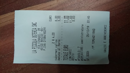 Per finire il caffè, che è stata un altra sorpresa, una miscela davvero piena e aromatica, un arabico con forti note di cacao. E mi ha stupito notare che il caffè è di produzione Rodigina, brand Rhodigium, letteralmente prodotto e venduto a pochi passi da questo ristorante.