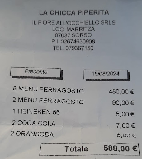 Read moreRistorante di altissimo livello. Sono anni che frequento la Chicca Piperita trovandomi sempre bene sia per le ottime pietanze che per la qualità dei prodotti e del servizio. Tuttavia dopo essermi recato nella giornata del 13 marzo 2022, dopo mesi che non andavo, ho potuto constatare un aumento del livello culinario per la gioia del palato e quindi del cliente. Il mix di antipasti di mare caldi e freddi è risultato eccellente, con prodotti freschi e ben serviti. La zuppetta di cozze, facente parte del mix, straordinaria, così come saporite sono state le polpette di pesce, il carpaccio, il salmone ed i calamari. Anche le salse a base di peperone sono risultate buone, per nulla invadenti nel sapore e che, anzi, ben si sposavano con la freschezza delle pietanze. Che dire poi del risotto alla pescatora, assolutamente divino e da provare. Sapori ottimamente amalgamati e per niente pesanti. Ho trovato molto piacevole il fatto del risotto servito su piatto singolo e fondo piuttosto che su vassoio in abbondanza (come spesso accade quando si ordina il risotto), poiché la quantità equilibrata e rapportata alla mole di antipasti mangiati poco prima, ci ha permesso di finirlo tutto, gustandolo senza sentirci alla fine appesantiti o poco soddisfatti. Il dolce, nel mio caso una millefoglie scomposta, è stato semplicemente stratosferico, degna conclusione per un pasto in cui davvero ci siamo sentiti di complimentarci con lo chef, che ha dimostrato non solo di saper cucinare ma di conoscere profondamente i prodotti ed il modo con cui esaltarli. Ma le lodi vanno tessute anche all'eccellente staff, bene organizzato, cordiale, preparato sulle pietanze servite, sempre attento e disponibile. Il prezzo poi, giusto e più che onesto. Ovviamente non mancheranno altre occasioni per ritornarci con estremo piacere e nel frattempo non posso che consigliarlo a chiunque voglia degustare dell'ottimo pesce fresco a Sorso, in un ristorante accomodante, a due passi dal mare, con parcheggio riservato, tra i migliori del...