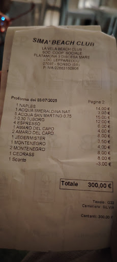 Read moreLocale carino all'aperto con vele in tela per riparo, mare non a vista diretta. Servizio pessimo! Un amico alla comanda(fatta dal titolare) richiede una pizza bianca con patate e gorgonzola. Al tavolo la portano con sugo, si fa notare l'errore, alchè la portano via per essere riportata a seguire per la seconda volta con un altro cameriere... Facendo notare che era la stessa pizza viene nuovamente richiesta bianca e con precedenza, visto che il resto del gruppo aveva iniziato a mangiare da parecchio. Morale della favola, dopo un po' riportano per la terza volta la stessa pizza ormai fredda da tempo... per fame si è ritenuto di non fare ulteriore richiesta!! Il bello è che il titolare del locale è venuto al tavolo(con aria supponente) affermando che quando lui sbaglia si adira con se stesso ancor di più che rispetto a un errore di un suo dipendente ... Consapevole dell'errore ha promesso il digestivo tramite cameriere; peccato che alla fine oltre ad aver pagato la pizza sgradita abbiamo pagato anche tutti i digestivi in comanda!! Prezzi assurdi, speso un patrimonio in acqua, listino pizze scarno e caro(non sono nemmeno gourmet). Unica nota lieta un gruppo musicale che ha allietato la serata. Non torneremo sicuramente... Dimenticavo, quasi 30 euro per due posate un tovagliolo di carta, un piatto e un bicchiere e immancabile 3 euro di sconto per fare cifra tonda e non incartarsi con...