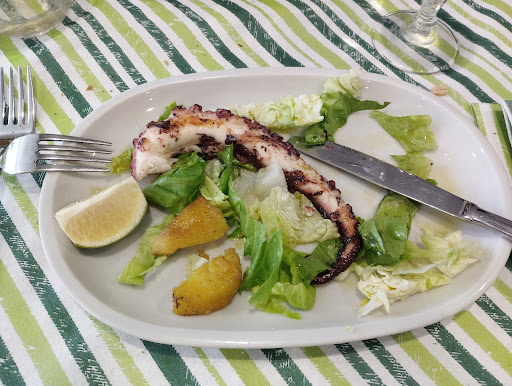 Read morePartiamo con l'accoglienza: ti guardano storto come se gli stessi facendo un torto. E vabbè devo mangiare non farmi trattare con i guanti di velluto. Menù: viva l'originalità, prezzi esorbitanti vista PONTINA! Molti i prodotti CONGELATI, OCCHIO! Vini? Boh! Arriviamo alla ciccia, o forse é meglio dire "crudo", arriva il tagliere, uno per la precisione, 4 fette di prosciutto, 4 di salame e altri salumi, 1 fetta di formaggio primo sale e 1 fetta di formaggio piccante con qualche oliva. Ok ma nulla di che, anzi per €13 é meglio che "stamosene a casa a magna'" ma vabbè. Abbiamo ordinato 2 Polpi arrosto con PATATE e insalata. Ad una certa arriva un piatto di insalata con due tentacoli da 20 cm circa di polpo, crudo all'interno, freddo e gommoso(non segnato come congelato sul menù), e come in foto, 2 patate CRUDE pure queste! Quando si parla di ristorazione forse ci dobbiamo sciacquare la bocca, perché questo non può essere definito ristorante. Occhio alle "sole" che stanno dietro l'angolo, anzi, su rotonda...