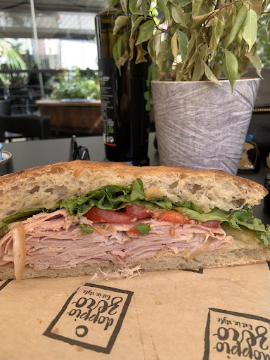 Delicious food- prosciutto sandwich on focaccia -the bread was perfect (bubbly and light as it should be)! Tasty cheese croquettes and house salad with chicken was delicious and definitely enough for two.